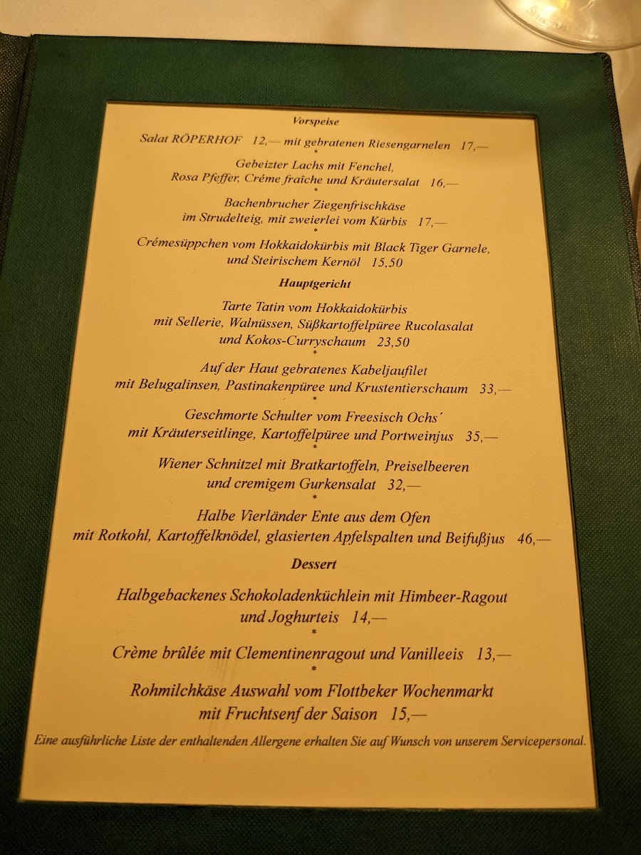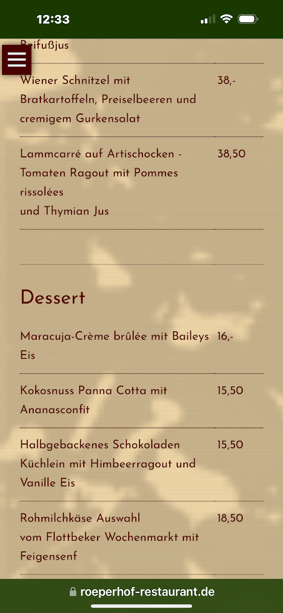 The main courses continue this confident approach with hearty yet polished dishes such as Halbe Ente, Lamm Karree, Lammhaxe Mit Glasiertem Gemüse Und Schnittlauch Püree, and Durch Kotelett Mit Tomaten Zucchini Auberginen Gratin Und Rosmarin Kartoffeln, each paired with traditional, well-judged accompaniments like Kartoffelgratin that emphasize comfort without sacrificing finesse. The progression of the menu feels natural and complete, moving seamlessly from lighter plates to more robust flavors. Desserts and sweets provide a satisfying final impression, with options like Sorbet, Nachtisch, Käsekuchen, Schokoladenküchlein Mit Himbeer-ragout Und Joghurt Eis, and Mille Feuille Mit Mascarpone Und Erdbeeren delivering a mix of freshness, richness, and classic technique. Taken together, the menu feels cohesive and thoughtfully curated, offering enough variety to appeal to different tastes while maintaining a clear culinary direction that reflects consistency, quality, and respect for both tradition and seasonal ingredients.